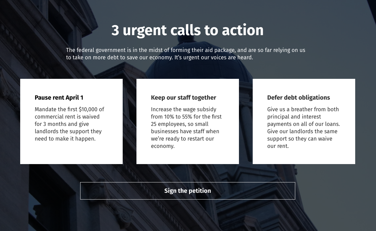- A grassroots coalition of small businesses across Canada. Sign the petition to support small businesses, and submit your story about how COVID-19 is impacting your business.